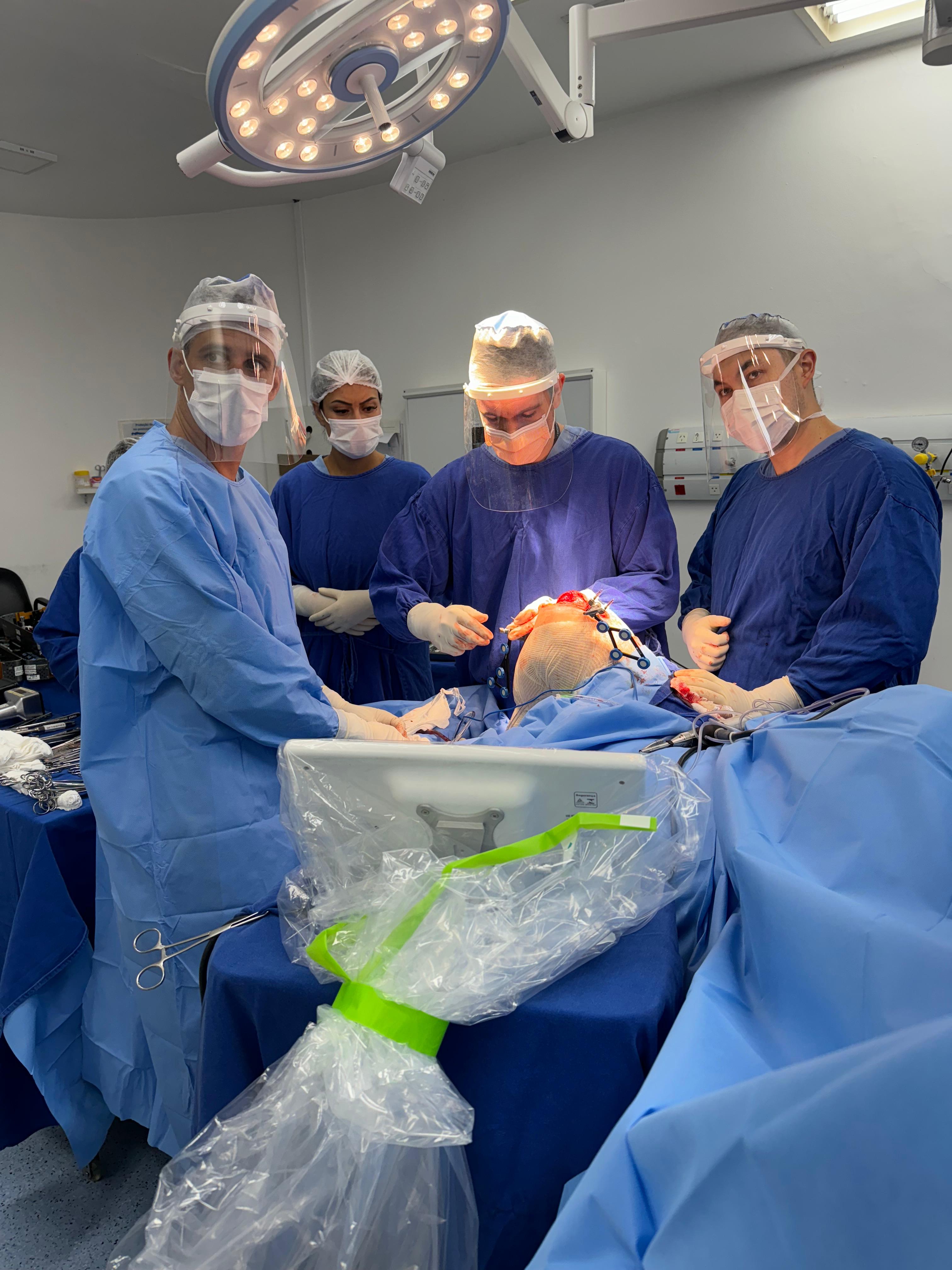 Durante a cirurgia, o robô ajuda o cirurgião a seguir o plano cirúrgico, permitindo ações precisas com a supervisão do cirurgião.
